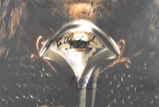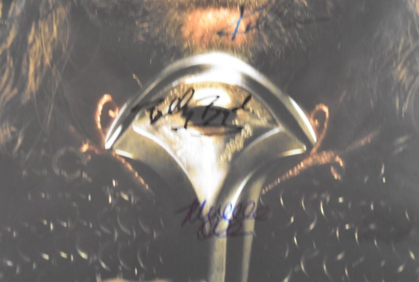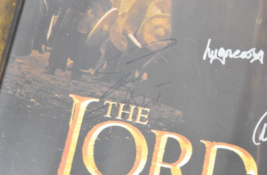 Three Lord of the Rings one sheet style film posters bearing multiple signatures, one accompanied by certificate of authenticity by Machiavelli 1520, two rolled and one framed, largest 97 x 70cm.