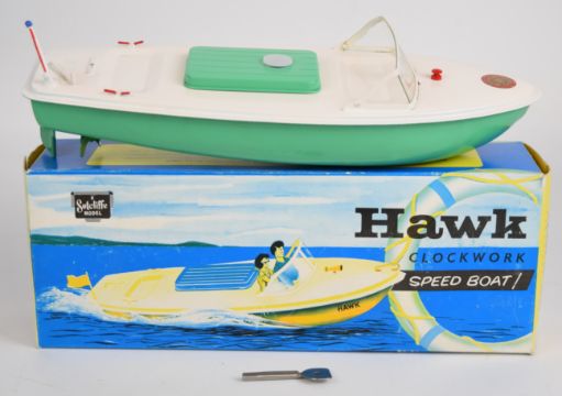 Three Sutcliffe Models tinplate clockwork speedboats comprising Hawk, Comet and Commodore, all in original boxes.
