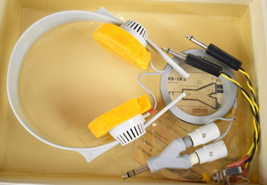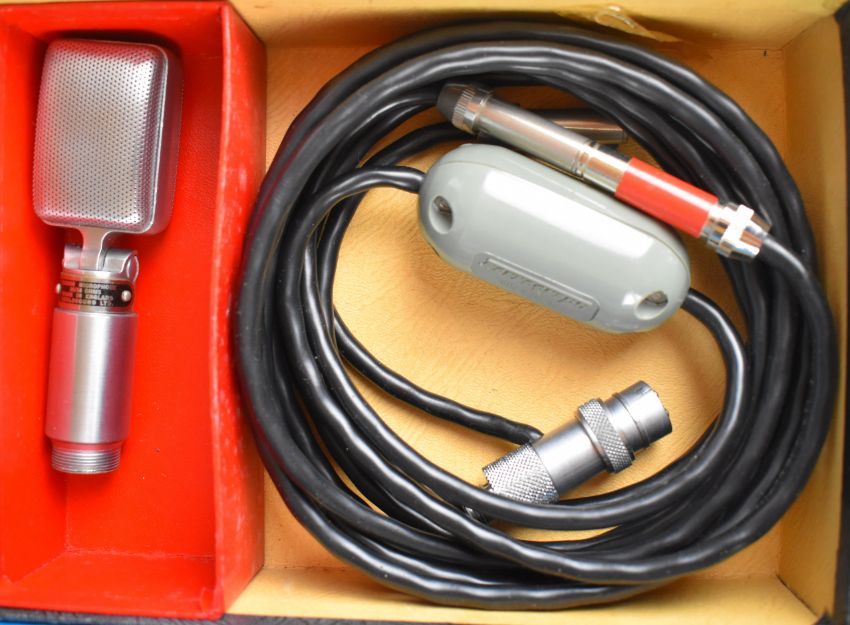 Two Sennheiser MD 412 LM directional studio microphones, HD 414 headset and a vintage ferrograph ribbon microphone 30/50 ohms, all boxed