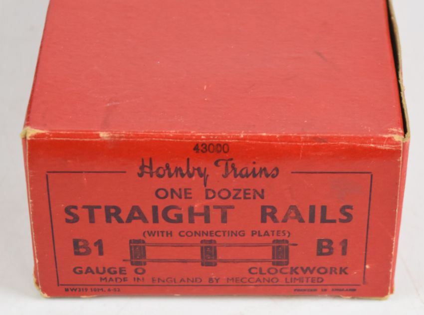 Hornby 0 gauge model railway items comprising tank locomotive with tender, rolling stock and assorted track, all in original red boxes.