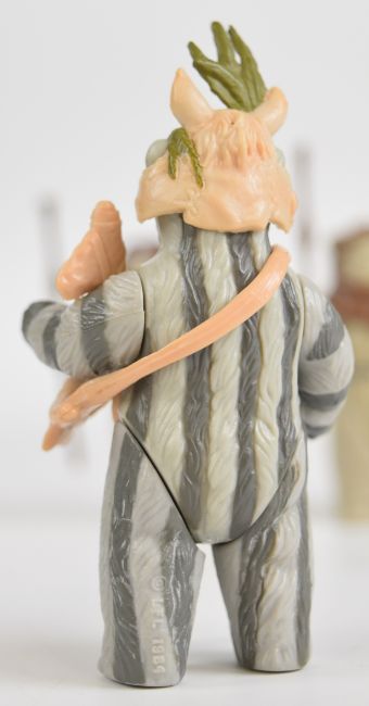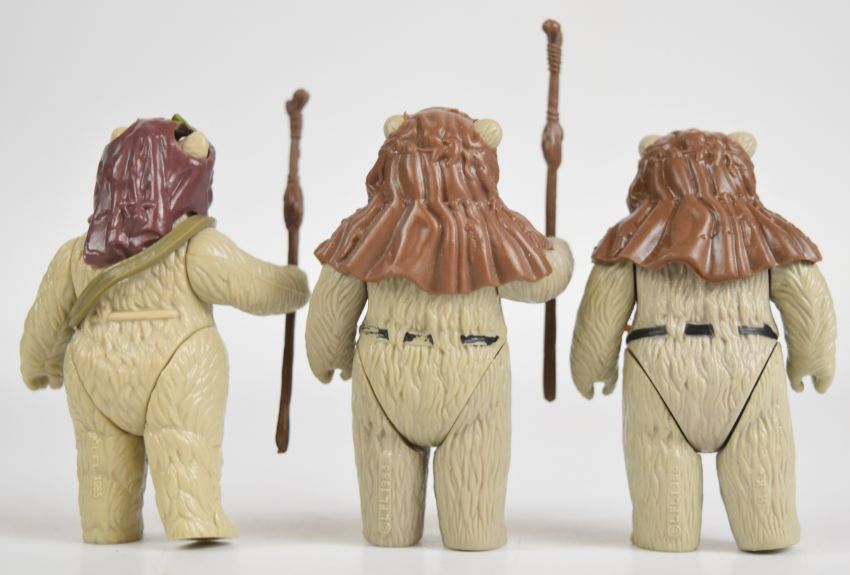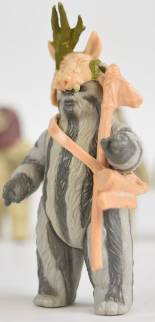 Six vintage Star Wars Ewok action figures by Kenner comprising Warok, Wicket, Teebo, Logray and two Chief Chirpa, some with accessories.