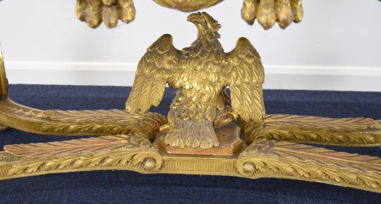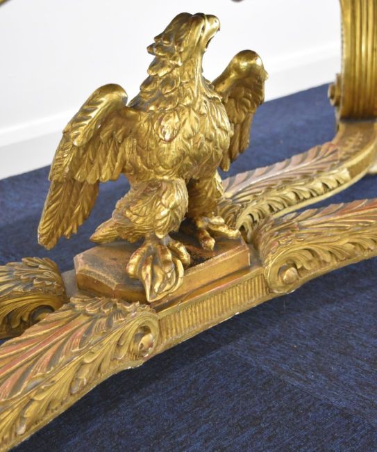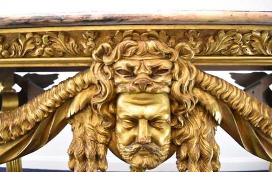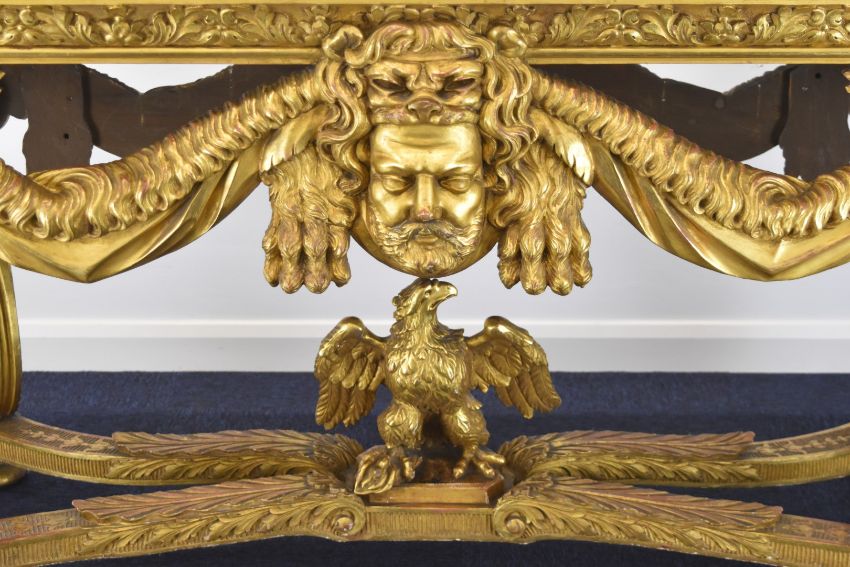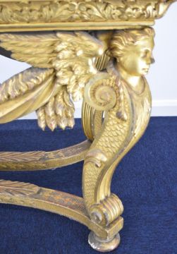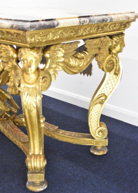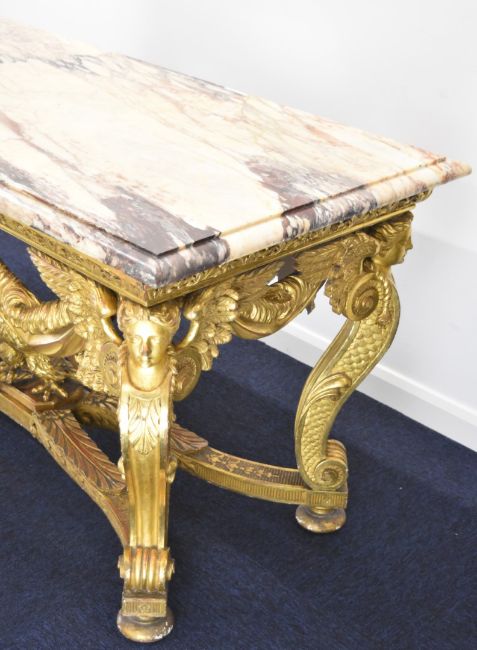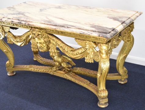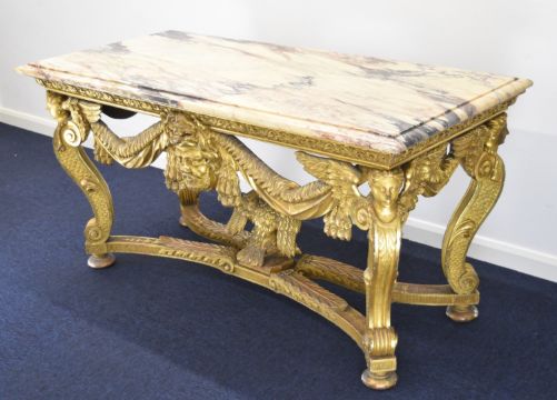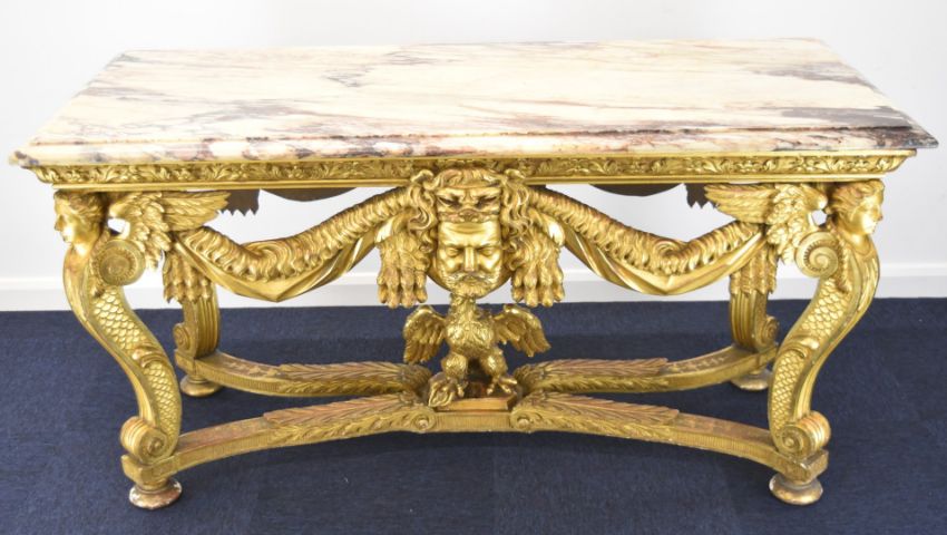 William Kent or similar gilt George II centre table, the variegated marble top having moulded edge, the gilt carved wood base having central masks to each long side, joined to the winged caryatid legs by swags, the legs also having fish scale decorated sides and united by stretchers with acanthus leaf decoration and central eagle, overall size L164 x W77 x H82cm, Provenance:- the vendor's late mother purchased the table in the late 1940s/early 1950s from a top London dealer as a genuine William Kent table, in order to furnish their house which was purchased around this time for £7,000