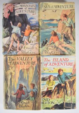 Enid Blyton The Adventure Series to include first editions of The Valley of Adventure, Macmillan 1947. The Sea of Adventure, Macmillan 1948 and The Mountain of Adventure, Macmillan 1949 together with a copy of The Island of Adventure, Macmillan 1948 first reprint, all with illustrations by Stuart Tresilian, bound in pictorial cloth bindings and all with their original scarce colour illustrated unclipped dust-wrappers (4)