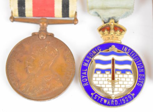 Masonic jewels and enamelled badges to include medal from the Lodge of Sympathy stamped 1932-1933 with ribbon, Royal Masonic Institute For Girls 1937 with Steward bar and Gloucestershire pin, Masonic Steward medal for 1949 with badge and medal for Special Constable, Royal Horse Artillery badge, National Union of Motor Vehicle Builders pendant and small shield badge, YMEC (possibly York Motor Eboracum Club) with flags, racing car etc
