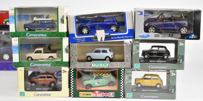 Thirty-five Mini-Cooper related diecast model cars, manufacturers include Corgi, Dinky, Oxford, Hongwell Cararama, Lledo, Welly, Newray and Schuco, all in original boxes.
