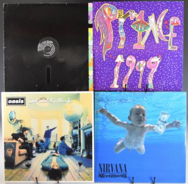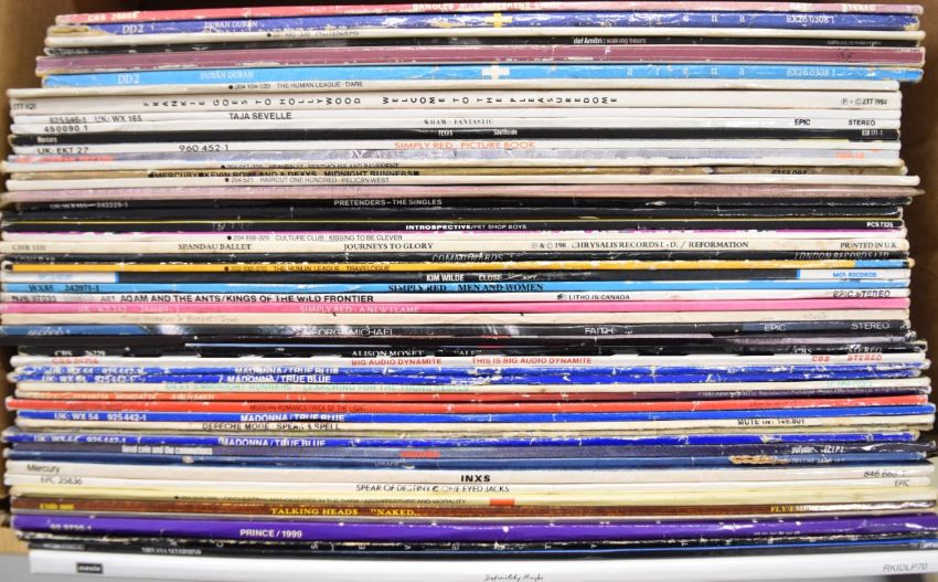 Fifty two mainly 1980s Post Punk / Indie LPs including Nirvana Never Mind, Oasis Definitely Maybe, Prince 1999, Human League The Dignity of Labour Parts 1-4 (with 7" flexi disc), Talking Heads, OMD, Spear of Destiny, INXS, Depeche Mode, Dexys Midnight Runners, Police, Pretenders, Pet Shop Boys, Spandau Ballet, Adam & The Ants, Toyah, George Michael, Duran Duran etc, together with 12" single New Order Blue Monday. Records generally appear VG+, some will grade higher or lower