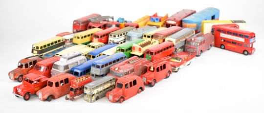 Forty vintage Corgi and Dinky diecast model cars, buses and trucks to include Chipperfield's Circus Horse Box, Commer 3/4 Ton, Transmitter Van, Chevrolet Impala and Pinder Jean Richard Chevrolet van,