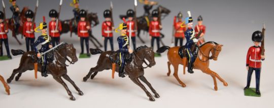 Fifty-four Britains painted metal toy soldiers to include Hussars and Scots Guard regiments, contained in three boxes.