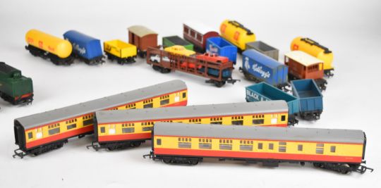 Hornby and Lima 00 gauge model railway items to include six locomotives, nineteen goods wagons, passenger carriages etc.