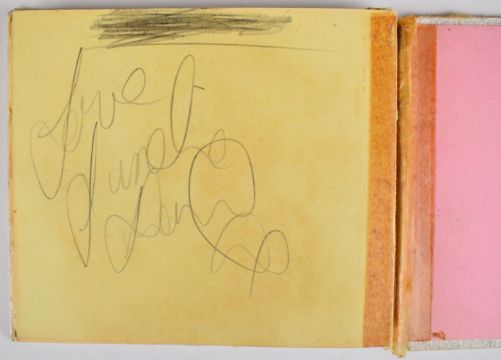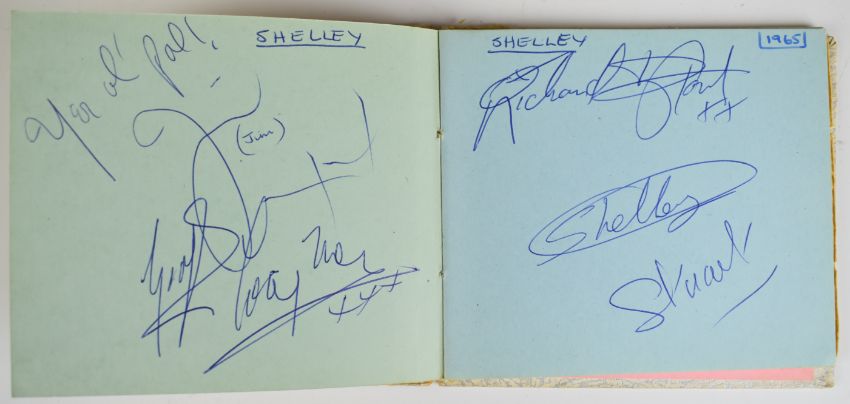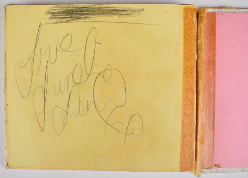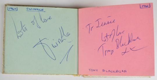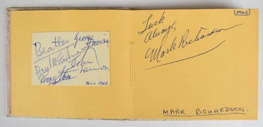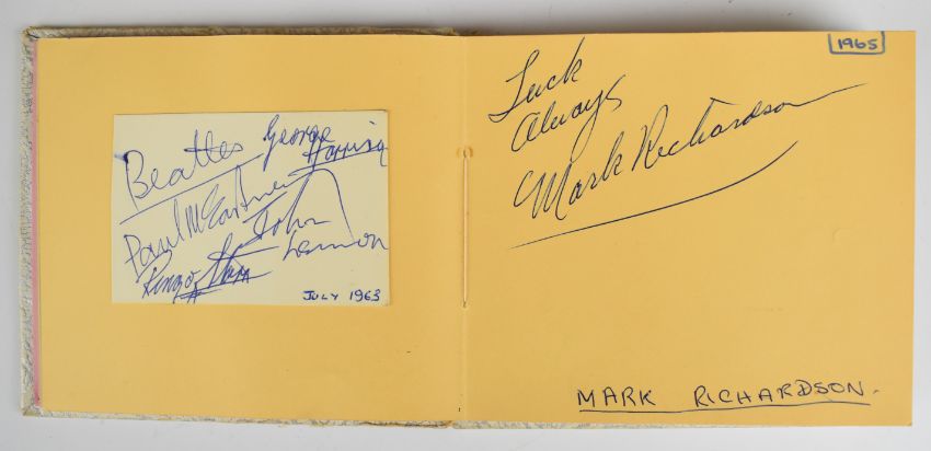[Beatles] Autograph album containing signatures of The Beatles (John Lennon, Paul McCartney, George Harrison and Ringo Starr) in the hand of Paul McCartney dated by the recipient July 1963 on cut sheet and pasted into the album which also contains signatures of other bands including The Hollies, The Kinks, Herman’s Hermits, Sonny & Cher, The Byrds, The Honeycombs, Pretty Things, Moody Blues, St. Louis Union (1966), The Silkie, Shelley, Goldie & the Gingerbreads, The Walker Brothers, The Small Faces, Peter, Paul and Mary (Colston Hall 1965), Wayne Fontana & The Mindbenders, The Measles, Them, Cliff Bennett & the Rebel Rousers, Mal Ryder, Tony Blackburn, Twinkle, Kent Walton, Tony Prince, Mark Richardson, other signatures written directly onto the album page and dated 1965 by the recipient 10 x 11cm (boards worn), together with covering letter from Sotheby’s dated 1987. The vendor obtained the Beatles autographs in person at the stage door of the Odeon Cinema, Weston Super Mare in 1963 and the others at the ITV studios in Bristol when appearing on the programme ‘Discs A Go Go’