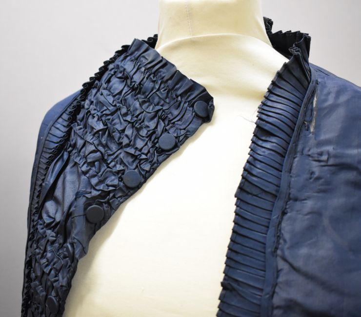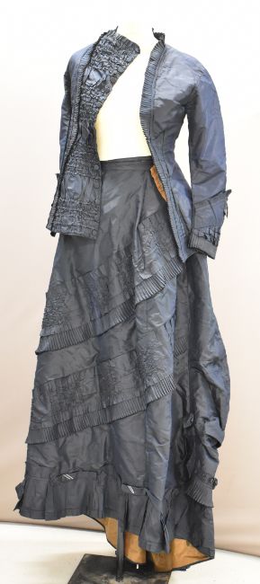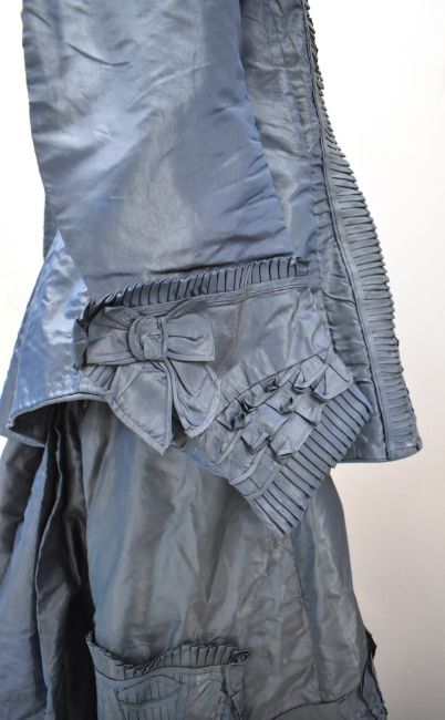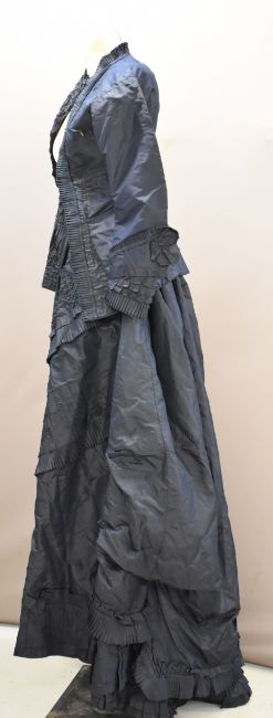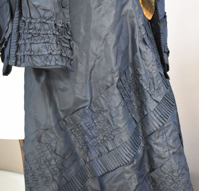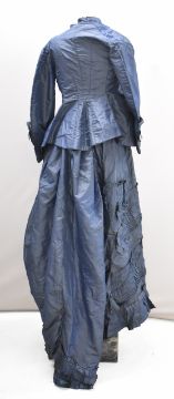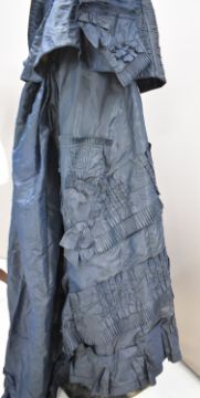 Victorian teal dress / bodice with skirt decorated with ruffles and swags