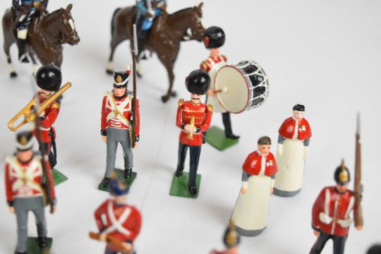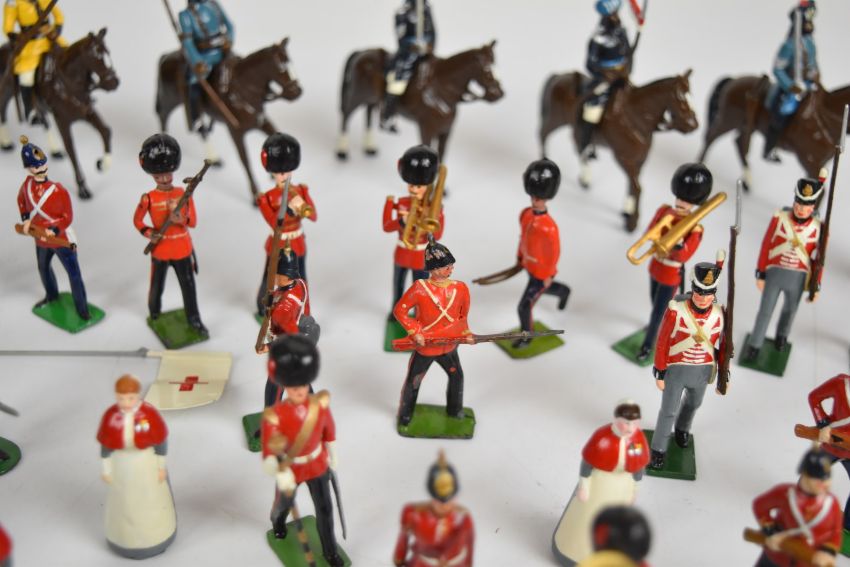 Sixty-two Britains painted metal toy soldiers to include British Redcoats, Guards Band, Nurses and Indian Lancer regiments.