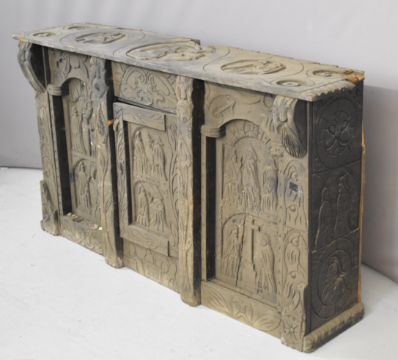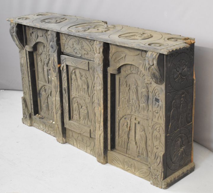 17th / 18thC carved oak three door cabinet with religious iconography, possibly much older than stated, W159 x D37 x H88cm