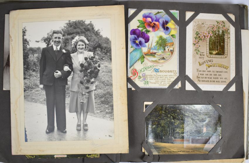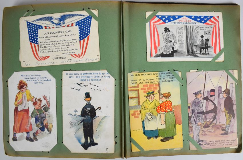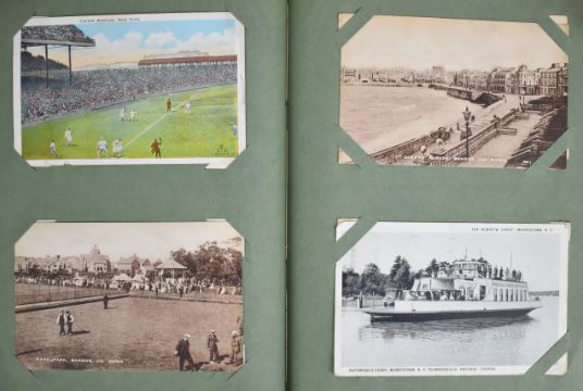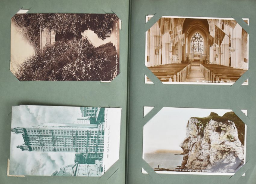 A collection of approximately 550 largely Edwardian postcards, mostly of Ireland and New York including street scenes in and around Dublin, Donaghadee, Londonderry, Galway, Coagh, Bangor, Donegal, Belfast, Lurgan, tennis courts at Ballycastle, the Ballynahineh Railway Station, Co. Antrim, the Ballinderry L.O. Lodge 797 of 1909, Sons of Ulster L.O.L. No.188, New York landmarks including the Yankee Stadium, Wall Street, Hall Gate Bridge, Roxy Theatre and Olcott Beach, Brockville & Morristown ferry, Washington and scenes from Canada including Toronto, Niagra Falls and 'When Niagara Ran Dry', Steamers 'Turbinia' and 'Toronto', 'Americana' others of Glasgow, Liverpool, Manchester etc, and images in and around Rugby, Mauretania in Gladstone Dock, TTSS 'Cameronia', Clare Romain (actress), King George V, humour and several cards in the Bamforth 'Songs' series and Valentine’s series, family portraits etc, housed in 3 albums