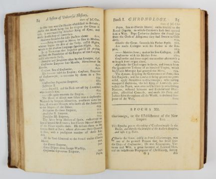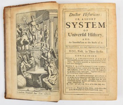 Thomas Hearne Ductor Historicus: or, A Short System of Universal History, and An Introduction to the Study of it. The second edition, very much Augmented and Improved, printed for Tim Childe at the White-Hart at the west-end of St. Paul’s Church-Yard 1705, volume first in Three Books (bound in one) with an engraved frontispiece, bound in leather with raised bands and gilt title label spine