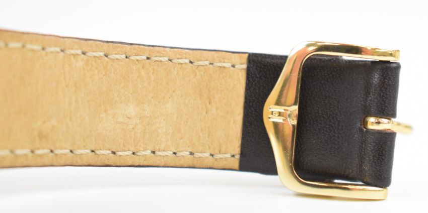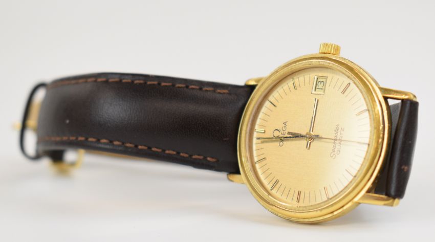 Omega Seamaster gentleman's wristwatch ref. 196.0266 with date aperture, two-tone hands and baton hour markers, gold dial, gold plated case and quartz movement, on black leather strap, case diameter 33mm.