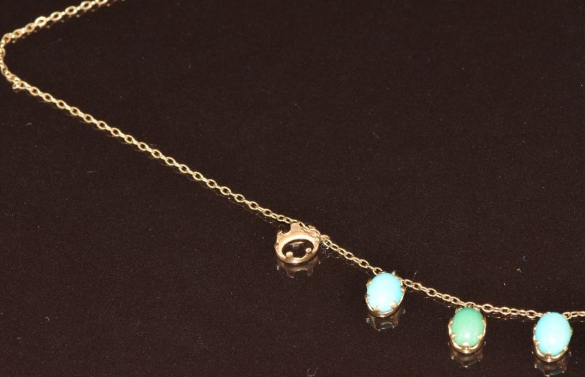 Edwardian 9k gold necklace set with turquoise cabochons (one missing), 3.6g, 40cm