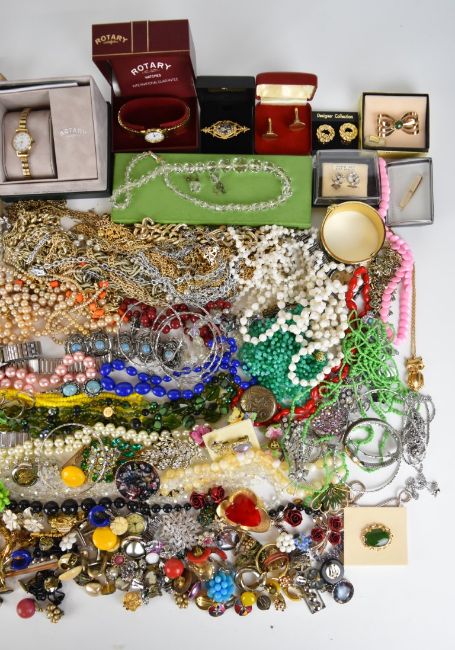 A collection of costume jewellery including vintage, jadeite and Hollywood brooch, cufflinks, crystal beads, Jewelcraft earrings, diamanté, beaded necklaces, Rotary watch, 9ct gold ladies wristwatch, vintage earrings, etc