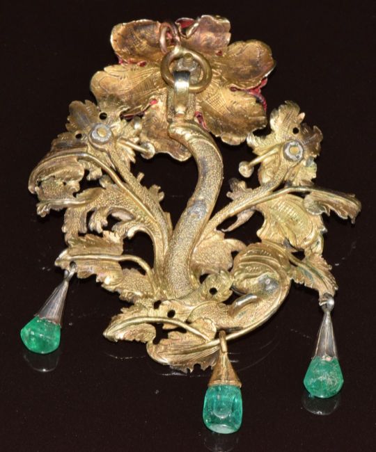 An early 19thC silver gilt pendant/ brooch set with foiled emeralds, citrines and rose cut paste, with further drop emeralds and enamel decoration, in original fitted Harvey and Gore, Vigo Street, London box, 9 x 6cm