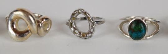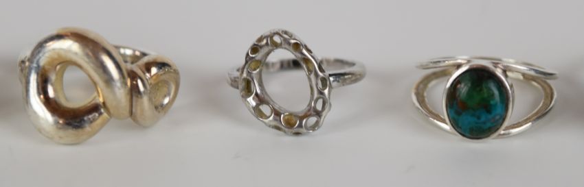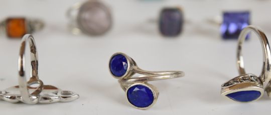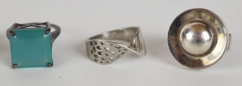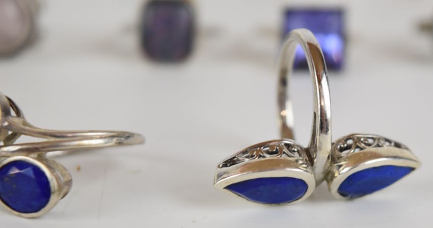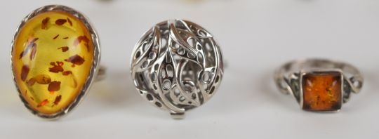 Eighteen silver rings including pressed amber, tiger's eye, amethyst, agate, etc