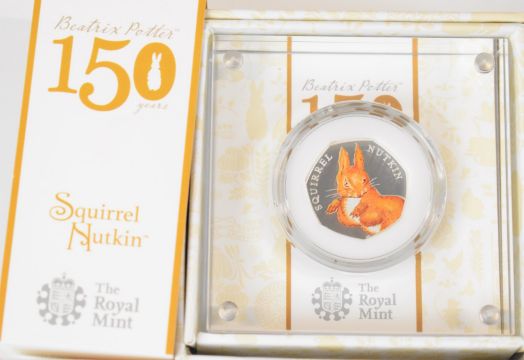 Six Royal Mint Beatrix Potter limited edition silver proof 50 pence coins, comprising 2016 Squirrel Nutkin, Mrs Tiggy-Winkle and Jemima Puddle-Duck and 2017, 2018 and 2019 Peter Rabbit, all in original boxes with certificates