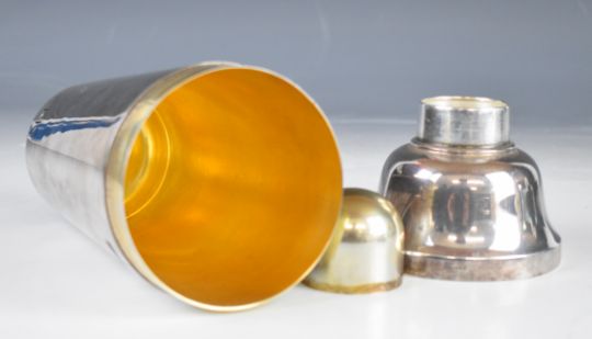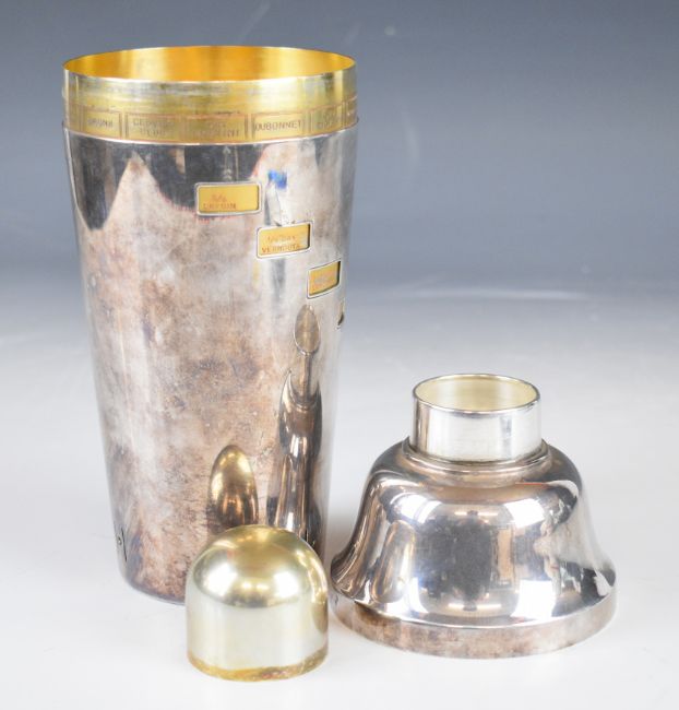 Asprey silver plated and gilt cocktail shaker with turning body showing ingredients for different drinks, marked to base Asprey London, overall height 26cm
