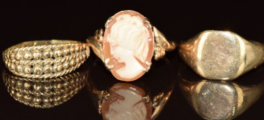 Three 9ct gold rings, one set with a cameo, 5.4g, size M, K & L
