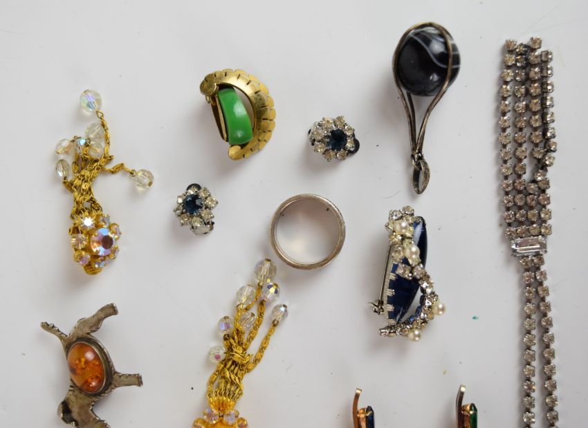 A collection of jewellery including two Celtic silver rings, silver pendant set with agate, pair of silver earrings, silver dog brooch set with amber, pearl brooch, four 1970's brooches marked 41, earrings, diamanté necklace, etc
