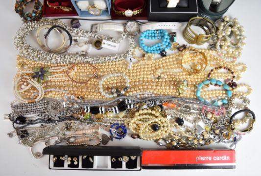 A collection of jewellery including beaded necklaces, bracelets, agate necklace with silver pendant, hematite necklace, Folli Follie necklace and bracelet, E.Pearl earrings, Bibi necklaces and bracelets, 9ct rolled gold bangle, pearl necklaces, pearl bracelet, Swarovski ring and earrings, Rotary, Citizen Eco Drive watch and other watches, etc