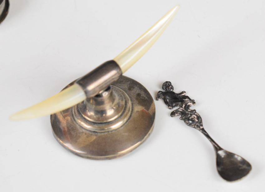 Victorian hallmarked silver novelty oversize thimble, London 1890, maker Jesse Earls, length 6cm, weight 57g, hallmarked silver guilloché‚ enamel pill pot, salt and pepper marked sterling silver, similarly marked thimble, hallmarked silver mounted novelty salt formed as a swan, hallmarked silver and mother of pearl knife rest and a hallmarked silver mounted match striker