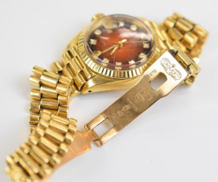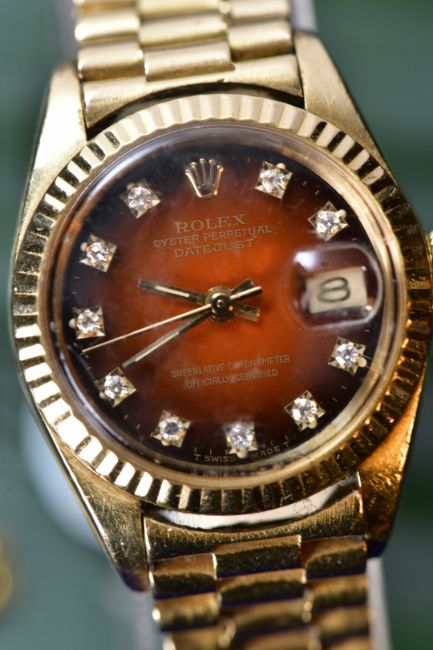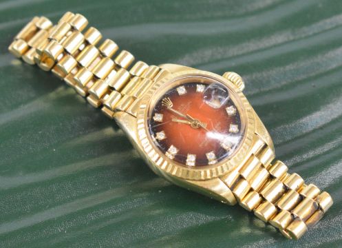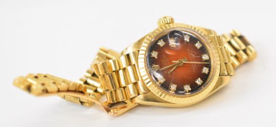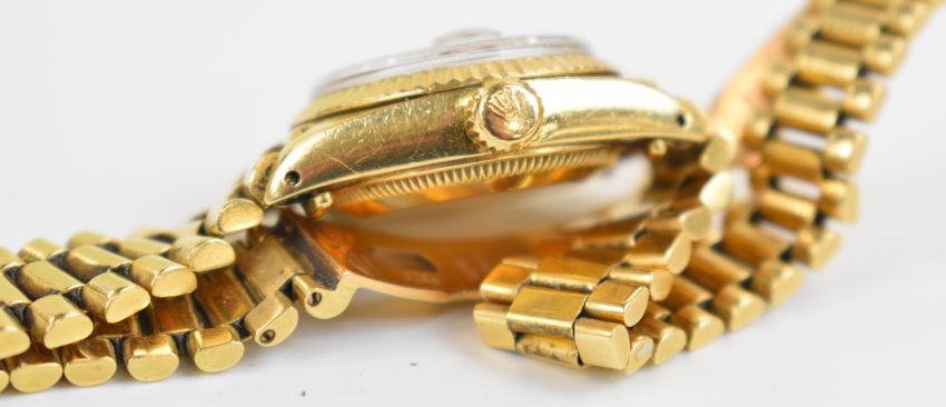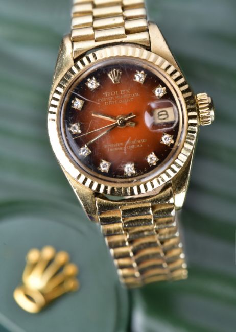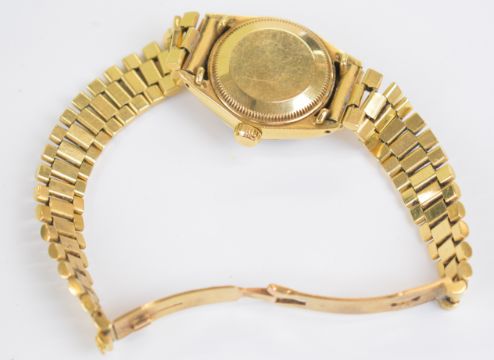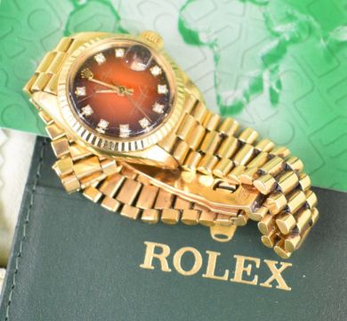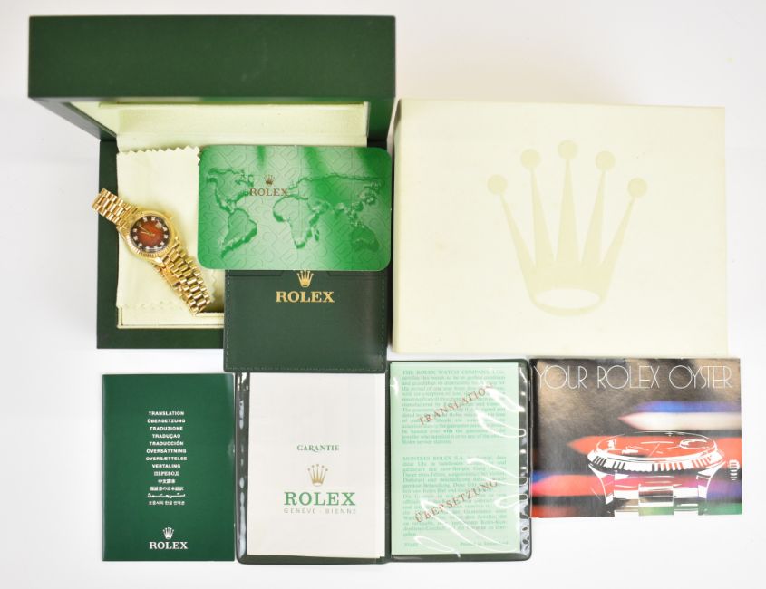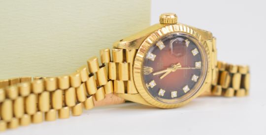 WITHDRAWN BY VENDOR Rolex Oyster Perpetual Datejust 18ct gold ladies wristwatch ref. 6917 with date aperture, diamond hour markers, graduated smoke dial, bevelled bezel and signed movement, on 18ct gold bracelet, case diameter 26mm, serial number 7171837, in original box with guarantee and related cards, paperwork and outer card box.