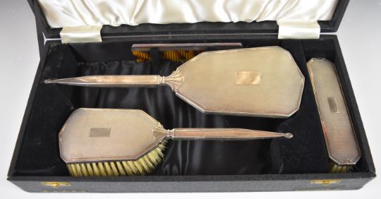 Hallmarked silver dressing table set, hand mirror and two brushes, hallmarked for Birmingham 1939/40, maker Charles S Green & Co Ltd, in W.C.Mann of Gloucester fitted case, length of case 37.5cm
