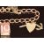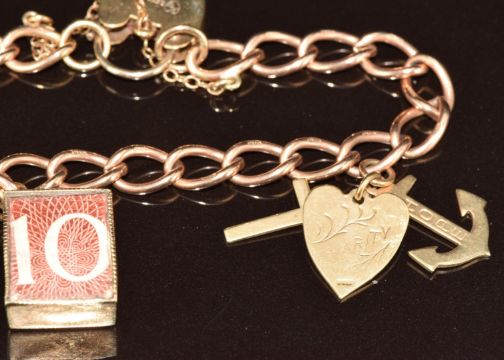A 9ct rose gold bracelet with four 9ct gold charms including 10 shilling note, 'I love you' swivel pendant, heart, anchor and cross (faith, hope and charity), and '13', 14.3g, 17cm