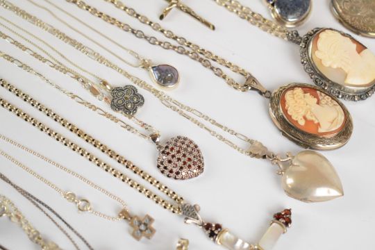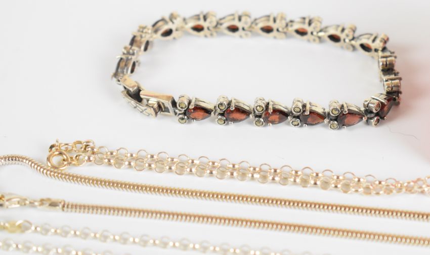 Five silver lockets including one set with a cameo, nineteen silver chains, fifteen silver pendants including mother of pearl, cameo, garnets, pearl, marcasite, reversible Whitby jet and mother of pearl, etc (280g) together with a matching necklace and bracelet set with garnets and marcasite (67g)