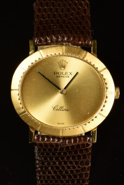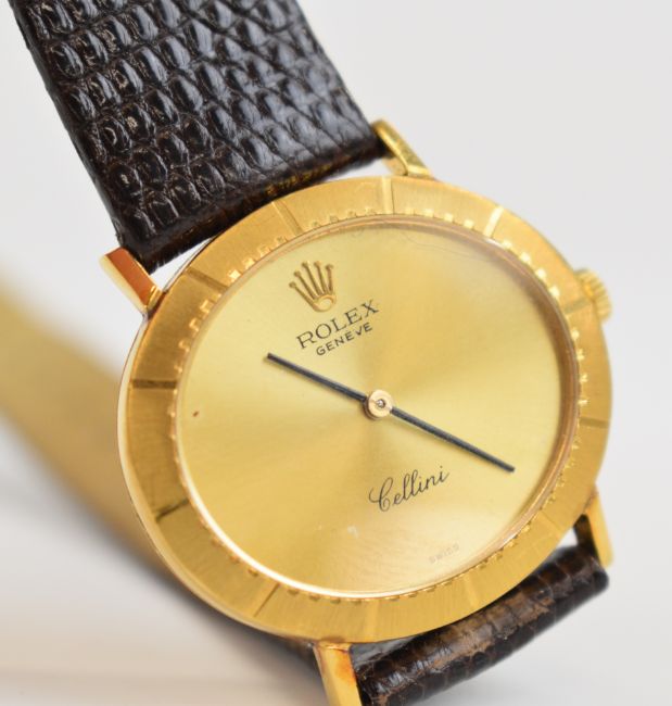 Rolex Cellini 18ct gold wristwatch ref. 4083 with black hands, gold dial and signed 19 jewel calibre 1600 movement, on brown leather strap, case diameter 32mm, serial number 4 212.