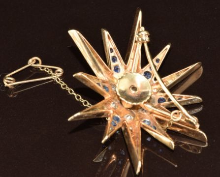 A 9ct gold star brooch set with split pearls, six old cut diamonds each approximately 0.15ct and sapphires, 12g, 4.8cm