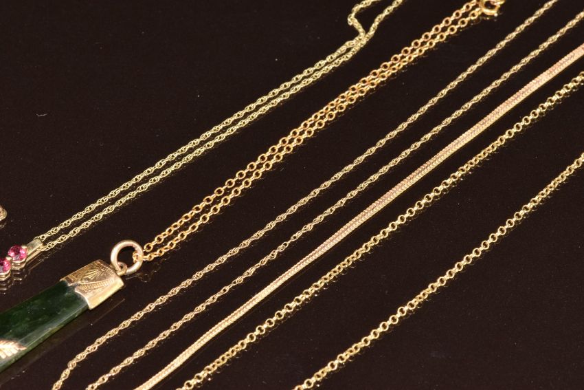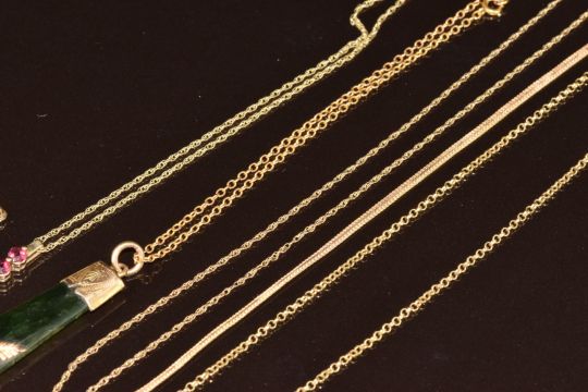 Four 9ct gold chains, 9ct gold bracelet, 9ct gold crucifix, 9ct gold pendant set with garnets (8.7g) and a nephrite jade pendant