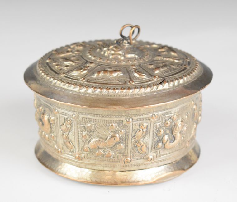 Burmese or similar silver trinket pot embossed with panels of animals to the side and lid and a snake signature to the base, diameter 10.5cm, weight 151g
