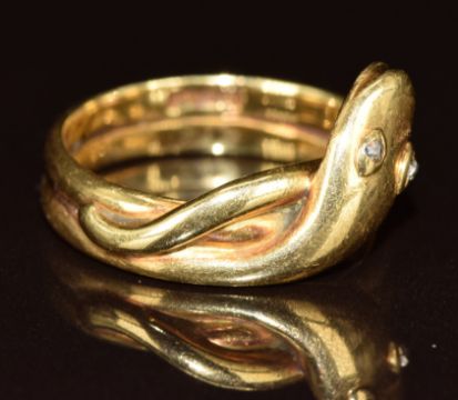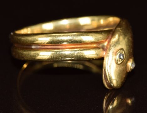 An 18ct gold c1900 ring in the form of a serpent set with rose cut diamond eyes, 5.4g, size K