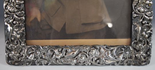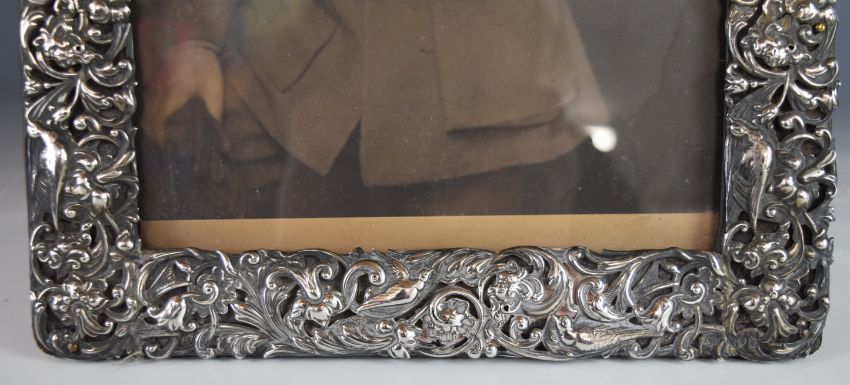 Large Victorian hallmarked silver photograph frame, to suit 12 x 6 inch photo, with pierced and embossed floral and bird decoration and velvet easel back, London 1894, maker William Comyns & Sons, overall height 38.5cm
