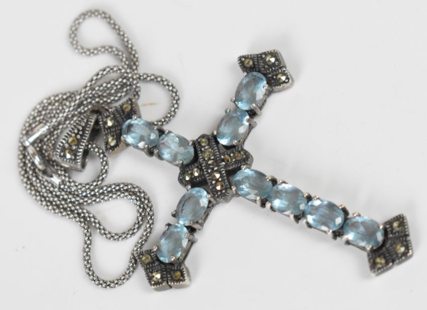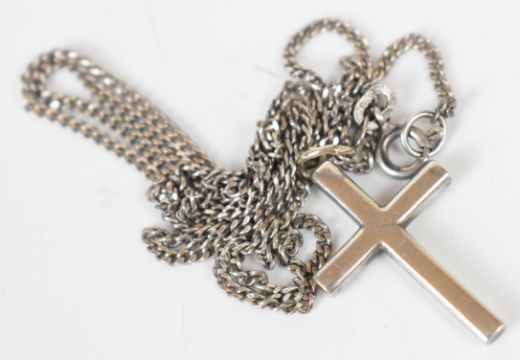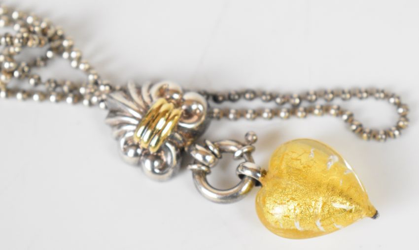 A silver necklace with 18k gold decoration and a glass heart pendant, originally bought from Jenny Wren, and two silver cross pendants on silver chains, 47.6g