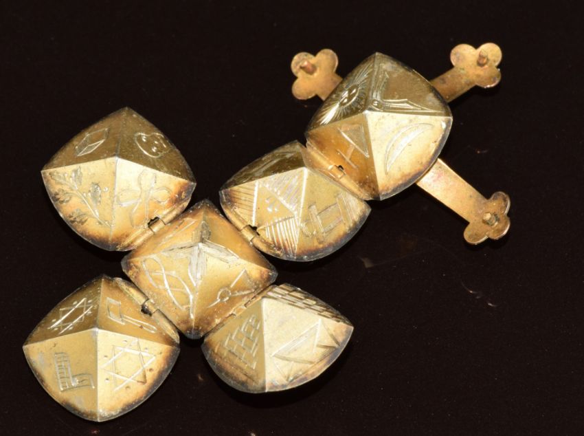 Masonic sphere charm opening to reveal a cross with engraved Masonic symbols, 12.1g