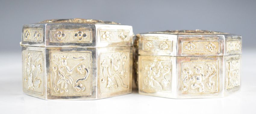 Four Chinese, Burmese or similar octagonal silver trinket pots with hinged lids, all with Chinese or similar character marks to bases, width of largest 6.5cm, weight of all four 242g
