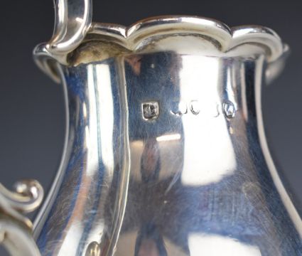 Victorian hallmarked silver milk jug with wavy edge and scroll handle, London, date letter rubbed, maker Lambert & Co, height 13cm, weight 255g