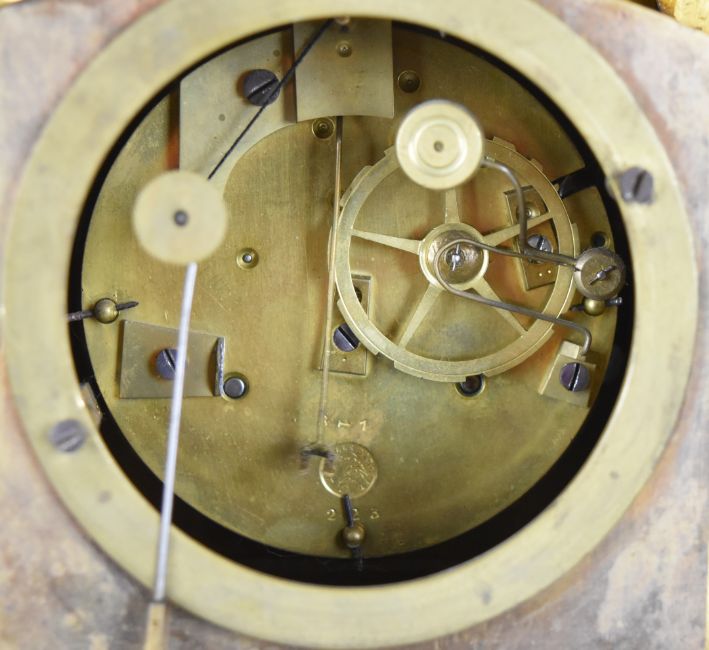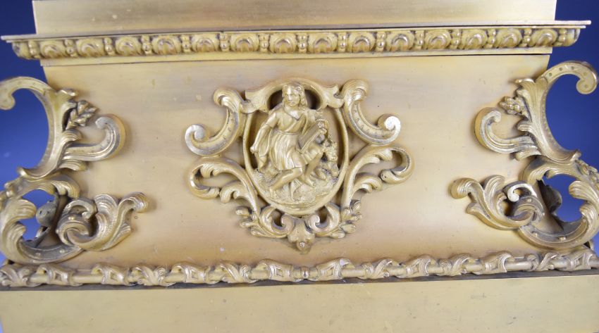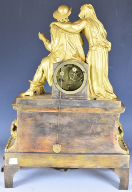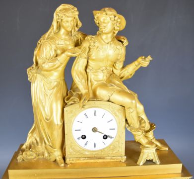 Vincenti French gilt metal mantel clock, the two train movement striking on a bell, surmounted by a courting couple, height 53.5cm