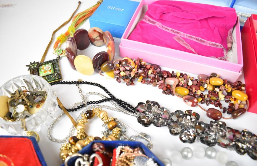 A collection of costume jewellery including garnet necklace and bracelet, silver and shell necklace set with amethyst and peridot, freshwater pearls by Honora collection, Bibi scarf, fresh water pearl necklace and bracelet with silver clasp, Lola Rose agate jewellery, pearl earrings, matching Butler & Wilson necklace and bracelet and another Butler and Wilson necklace, Swarovski bracelet, single silver earrings, etc