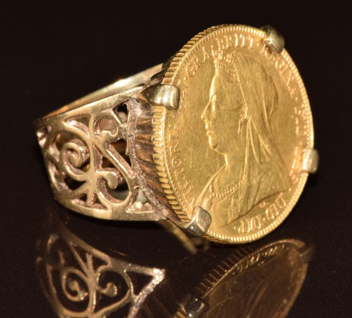 A 1900 gold full sovereign in 9ct gold mount, 15.6g, size Q