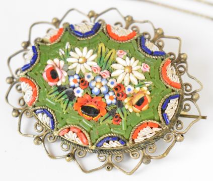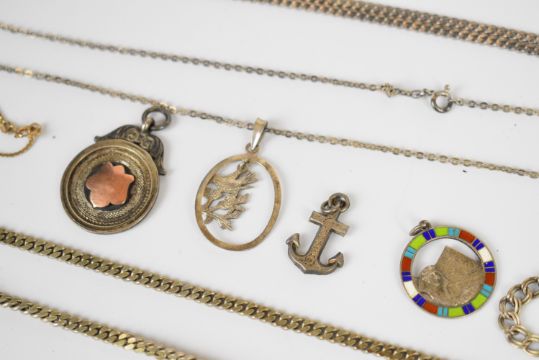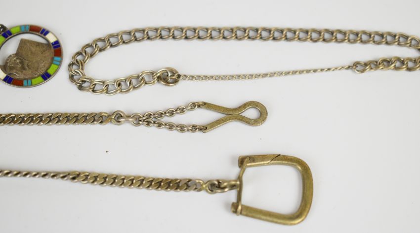 A collection of silver jewellery including Albert / watch chain, curb link chain, bracelet, chains, fobs, etc (118g) and a micro mosaic brooch