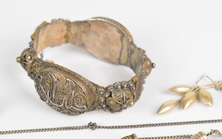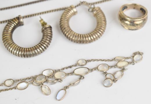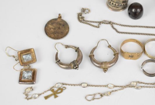 A collection of jewellery including white metal bracelet, four pairs of silver earrings, silver necklace set with moonstones, St Christopher, four silver rings, damaged 9ct gold ring (3g), etc