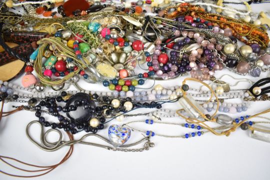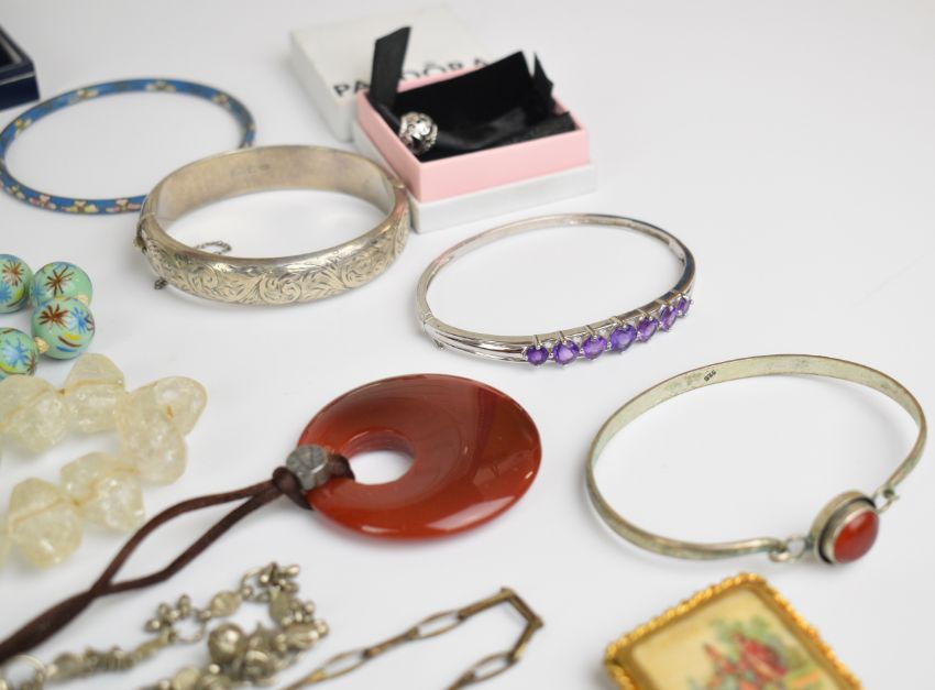 A collection of jewellery including a 9ct gold pendant (1.5g), silver including bracelet, chains, four pairs of earrings, bangle set with amethysts, bracelet and two rings, cloisonné bangle, ceramic beads etc